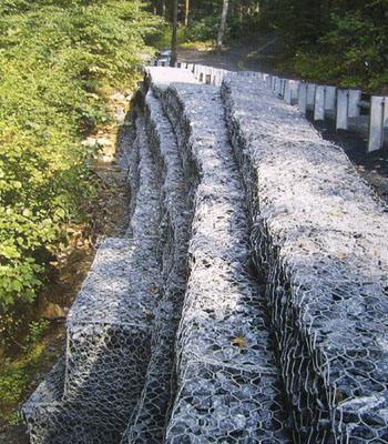 雷諾護(hù)墊是指由機(jī)編雙絞合六邊形金屬網(wǎng)面構(gòu)成的厚度遠(yuǎn)小于長度和寬度的墊形工程構(gòu)件,其中裝入塊石等填充料后連接成一體,成為主要用于水利堤防、岸坡、海曼等的防 沖刷結(jié)構(gòu),具有柔性、對地基適應(yīng)性的優(yōu)點(diǎn)。