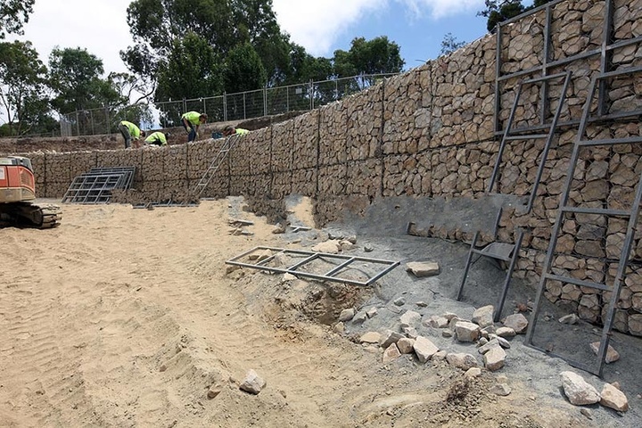 石籠網(wǎng)擋土墻,是石籠網(wǎng)籠子層疊堆砌的擋土建筑物。石籠網(wǎng)箱擋土墻的構(gòu)件是在網(wǎng)箱內(nèi)部填充大小比例相當(dāng)?shù)氖瘔K,這樣就有一定的孔隙率,由于石塊之間的間隙,可以排出砌體后面的土壤和護坡下面土層的水,這樣就降低了水位,減少墻體后和坡下的地表水壓力,水及時排出降低了擋土墻被破壞的幾率,這樣擋土墻的壽命會大大的延長。同時墻體網(wǎng)箱是鐵絲網(wǎng)制作的籠子,能夠有一定的變形,況且,石塊與石塊之間,也可以滑動,所以擋土墻的變形能力也能夠緩沖突發(fā)的外力。