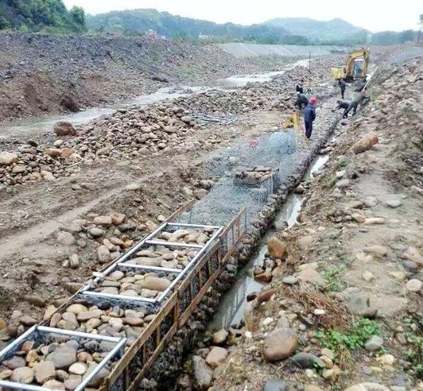 7、在石籠網(wǎng)內(nèi)填卵石時(shí),外露面應(yīng)用粒徑不小于10 cm的卵石,并用人工擺砌平整,以獲得美觀的表面和防止水流將卵石從網(wǎng)目淘走。應(yīng)保證超填石料2. 5~3 cm高,以便為沉陷留有余地。