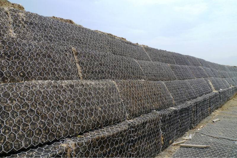 格賓網(wǎng)也稱重型六角網(wǎng)、擰花網(wǎng)、石籠網(wǎng)、三絞節(jié)機(jī)編網(wǎng)、雙絞格網(wǎng)是金屬線材編織的角形網(wǎng)(六角網(wǎng))制成的網(wǎng)箱,使用的金屬線徑是根據(jù)六角形的大小而不同.如果是金屬鍍層的金屬線六角形,則使用線徑為2.0mm到4.0mm的金屬線,如果是PVC包覆的金屬線編織的六角網(wǎng),則使用外徑為3.0mm到4.5mm的PVC(金屬)線.外框邊緣的線則使用比六角網(wǎng)線粗一號(hào)的線。格賓網(wǎng)是由經(jīng)表面防蝕處理的低碳鋼絲用機(jī)械編織的雙鉸六角形柔性金屬網(wǎng)經(jīng)剪裁,編邊和組合后制成的各種規(guī)格的網(wǎng)籠。