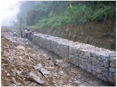 5.放置 綁好后,用機器小心將石籠網(wǎng)一個一個或兩個兩個的吊放到恰當(dāng)位置。為了保證質(zhì)量,石籠網(wǎng)縫邊、組裝時應(yīng)用較粗的邊絲和綁絲。