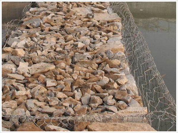 (3)將組長好的籠體安裝在所需的位置上,并與相鄰的籠體綁扎連接,將準(zhǔn)備好的石塊或卵石填入籠中,要作適當(dāng)?shù)拇a排,以達到較高的密實度,石塊直徑一般須大于網(wǎng)目的兩倍,石塊要選用抗風(fēng)化能力強的石料。用拉筋來保持籠體形狀的規(guī)整,拉筋間距一般在300mm左右。