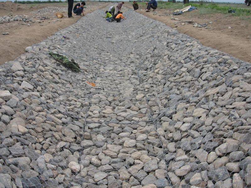 固濱籠具有固堤防沖刷的作用, 固濱籠工藝是指將特種鋼絲由專用機械編織成雙絞、蜂巢形網(wǎng)目的格網(wǎng)片,根據(jù)工程設(shè)計要求,裁剪、設(shè)計、組裝成箱籠并裝入塊石等填充料后連接成一體的結(jié)構(gòu),用作提防、路基防護工程。