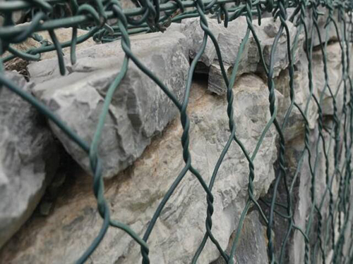 綠格網(wǎng)又稱“格賓網(wǎng)”、“石籠網(wǎng)”,由各種網(wǎng)孔規(guī)格的綠格網(wǎng)片按照ASTMA975-97規(guī)范組裝而成,工程現(xiàn)成填充石料組裝形成柔性的、透水的、整體的支擋結構,常用于生態(tài)防護工程。該結構采用高熱鍍鋅鋼絲或者10%鋅鋁合金鋼絲經(jīng)過雙線絞合編織而成的,其雙線絞合部分的長度不能低于45mm,以保證絞合部分的防腐性能不被破壞。因為環(huán)境比較惡劣,污染比較嚴重,所以鋼絲的表面涂塑(包PVC或者PE)增強鋼絲的抗腐蝕性能。