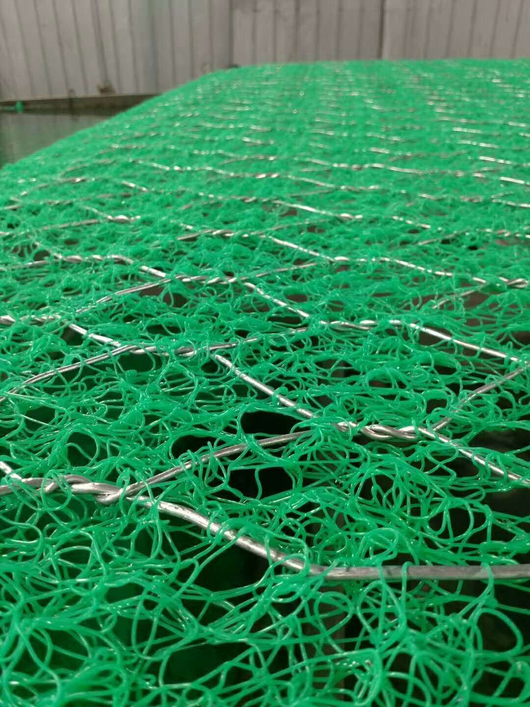 1、加筋三維植物網(wǎng)墊是聚丙烯經(jīng)過擠成單絲后無規(guī)則的疊成一定厚度并且通過熱黏結(jié)成土工網(wǎng)墊,具有開敞式的三維空腔結(jié)構(gòu),孔隙率大于90%,同時通過專門的設(shè)備,將各種鍍層(鍍鋅、鍍高爾凡、鍍鋁鋅合金、PVC覆塑)的雙絞合六邊形金屬網(wǎng)復(fù)合到柔性墊中。